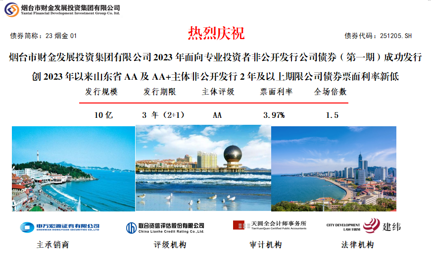 6月6日,煙臺財金集團2023年面向?qū)I(yè)投資者非公開發(fā)行公司債券(第一期)成功發(fā)行。本期債券發(fā)行規(guī)模10億元,期限3年(2+1),票面利率3.97%,全場認購倍數(shù)1.5倍,集團作為AA主體,創(chuàng)2023年以來山東省所有AA、AA+主體非公開發(fā)行2年及以上期限公司債券票面利率新低,且票面利率低于山東省2023年以來同級別、同期限非公開公司債253BP以上。本期債券發(fā)行由申萬宏源證券有限公司主承,聯(lián)合資信、天圓全會計師事務(wù)所及建緯律師事務(wù)所分別提供信用評級、審計和法律服務(wù)。